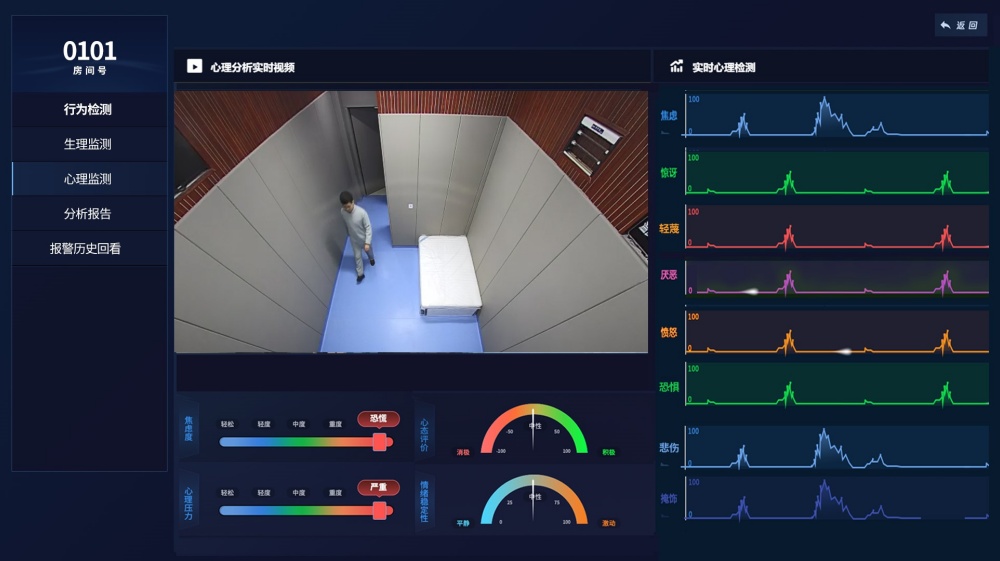 心理监测:对监居对象的开心、惊讶、轻蔑、厌恶、恐惧、愤怒、悲伤等7种基础情绪和掩饰、焦虑、否定等3种复合情绪识别和分析,对其心理健康程度、精神压力进行评估、记录和报警。